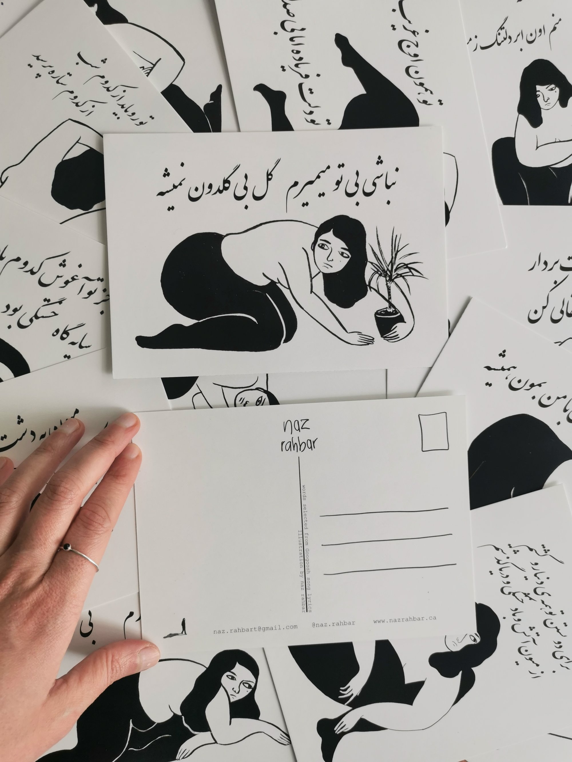 Set of 15 postcard designs. A cheat sheet with English translations provided with each set. 5x7" Illustration by Naz Rahbar Words selected from Googoosh song lyrics.